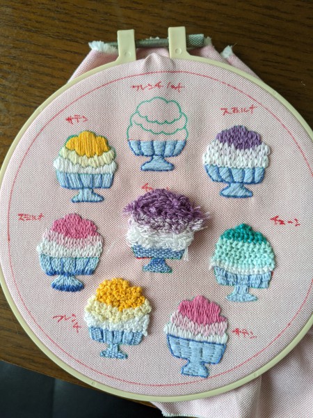 色としてはグラデーションになりそう、長さもそれなり。各種ステッチの練習も兼ねて、かき氷たくさん、違うステッチで刺してみることに。