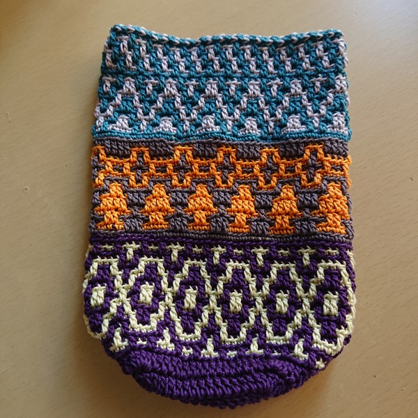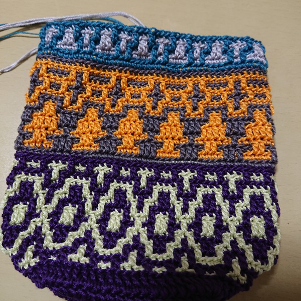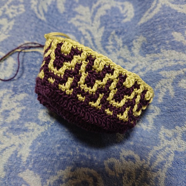 持ち手の存在を忘れたまま、縁を面倒な2色で2目のiコード編みしてしまった