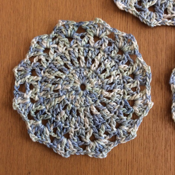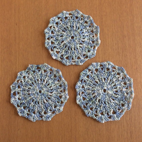 白、緑、青、三色グラデーション糸で編んだコースター。