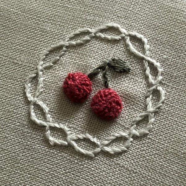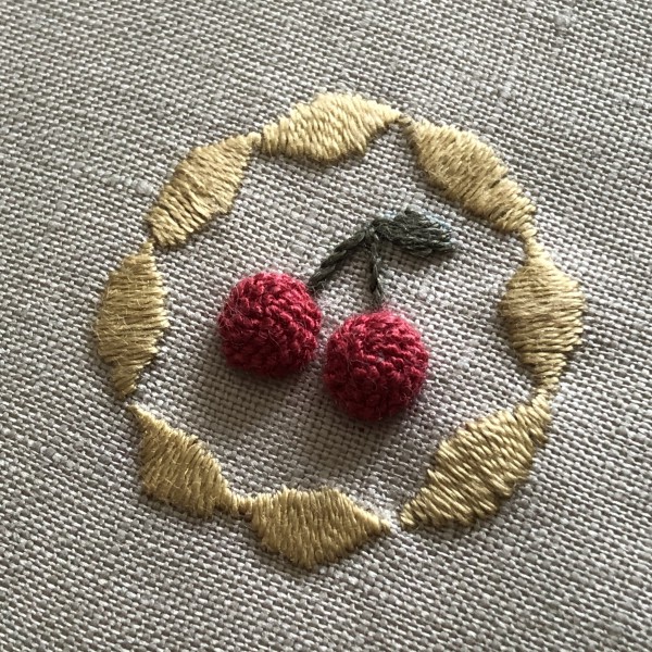 さくらんぼんの立体刺繍でくるみボタンのヘアゴムを作りました