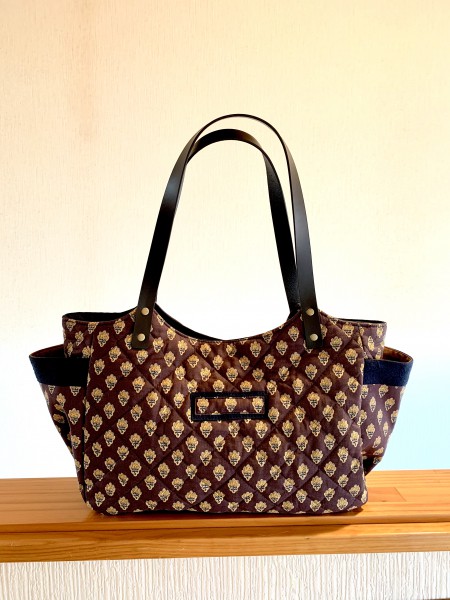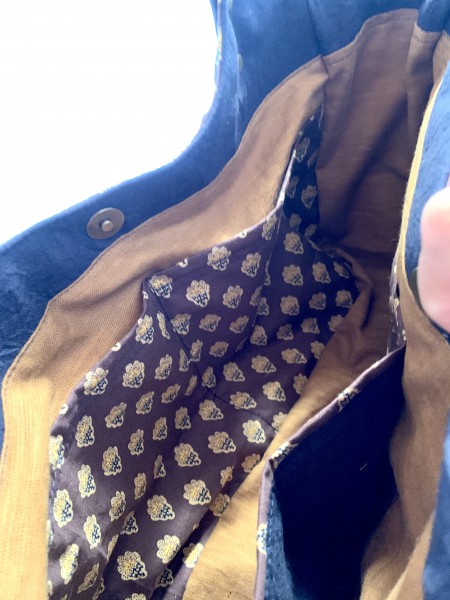 内側の色配置を考えました。外側ポケットの口部分にはキルトではなく同柄のシーチング使用。飾り生地をしましたが、目的はしっかり口が開くようにするためとメリハリを出すためです。黒に見えますが紺です。