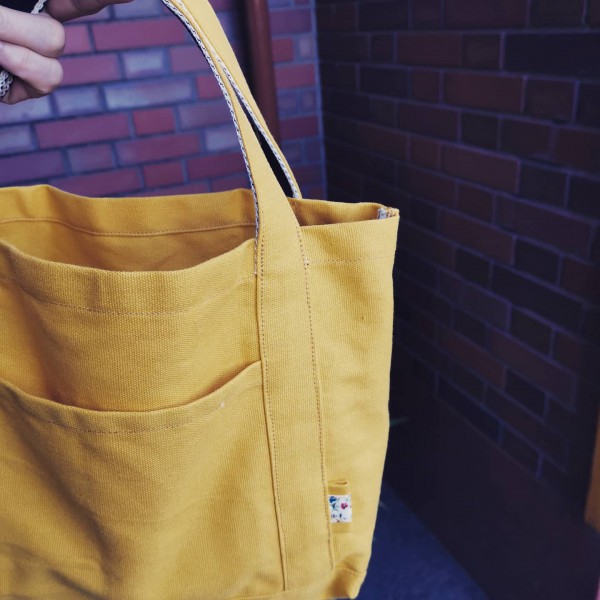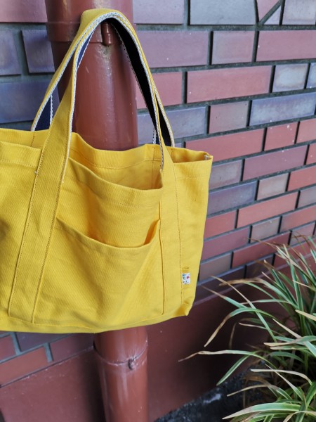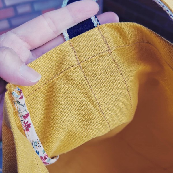 11号帆布でトートバッグを仕立てました。縫いやすきこは有りましたが、厚みがあるところや、マチが固くて,,,。ハンドルをしっかり裏打ちしたり、縫い代のパイピングを甘めのお花模様にしたり、お日様いろの素敵なバッグが出来ました。(*^_^*)