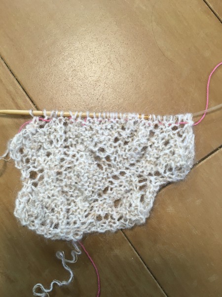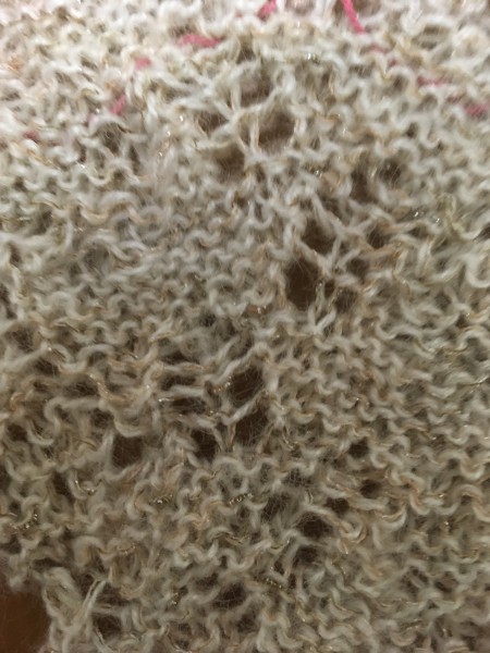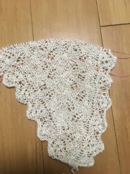 | モヘヤの毛糸でシェットランド・レースの三角ショールを編みます 嶋田俊之さんの「シェットランド・レース」を参考に編みました 華やかさも出したくて、ベージュのシルバーラメ入りの極細糸を引き揃えて編んでいます |
