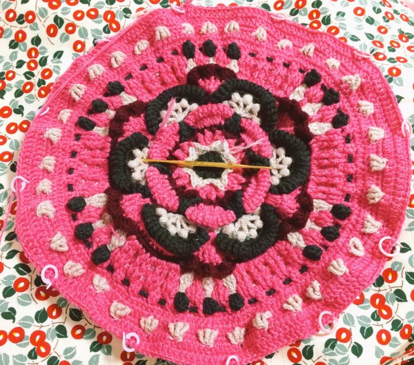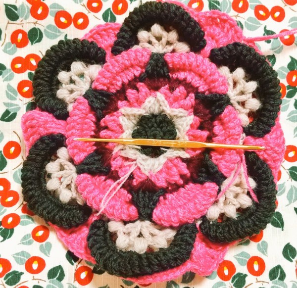 まだ六角形。一応ブランケットという名目だけど、170cmってすでにカーペットの域だと思って編んでいる。