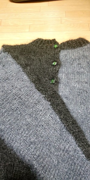 手持ちの毛糸を使いたく、同じ種類の黒とグレーの毛糸でアシンメトリーな色使いにしてみました。