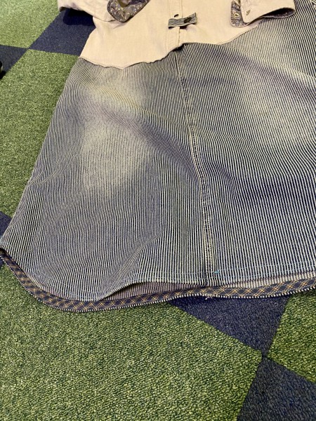 | 信じられないようなコントのような失敗作を量産中ですが…気を取り直して…こちらはまたリメイクものです。 デニム素材のシャツと着なくなったヒッコリーのロングスカート。断捨離に際して、どちらもディテール可愛らしく、どうせ捨てるなら1度リメイクしてみようと思い、ネットで色々参考にさせて頂き、ドッキングワンピースにしてみました。 幅が同じところで、またまた行き当たりばったりに裁断して、布端はジグザグ処理です。 スカート裾は自作バイアステープで処理。 本当は、フロントを裾までオーブンにしてはおりデザインにしたかったのですが…失敗しそうに思いここでストップしました。 夕暮れ時にワンコのお散歩くらいなら、外に来て行ける…かなと思います。 #リメイク #ドッキングワンピース |
