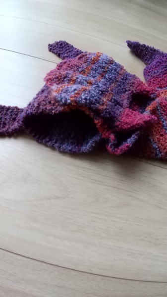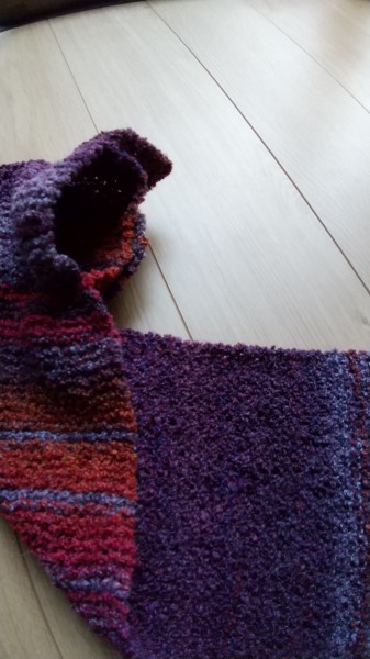 ちょっとポコポコしている毛糸で編んでみました。通し穴をつけてクルット首に巻けるようにしました。軽くて暖かいです。