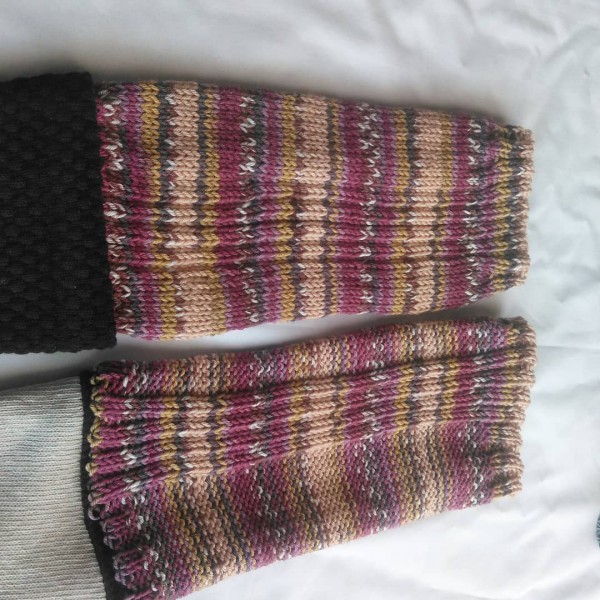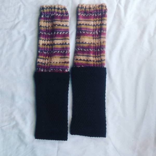 市販のアンクルウォーマーに編み付けてレッグウォーマーにしました。