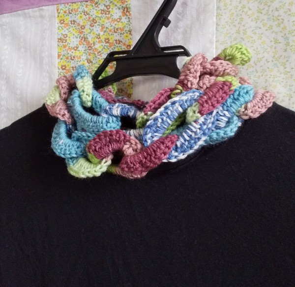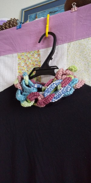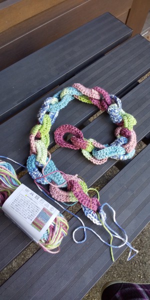 鎖編みを輪っかにして、長編みを一段。次々と繋げました。鎖編みの目数は、12目、14目、16目の3種を順番を決めず、ランダムにしています。