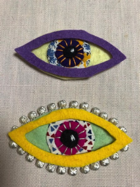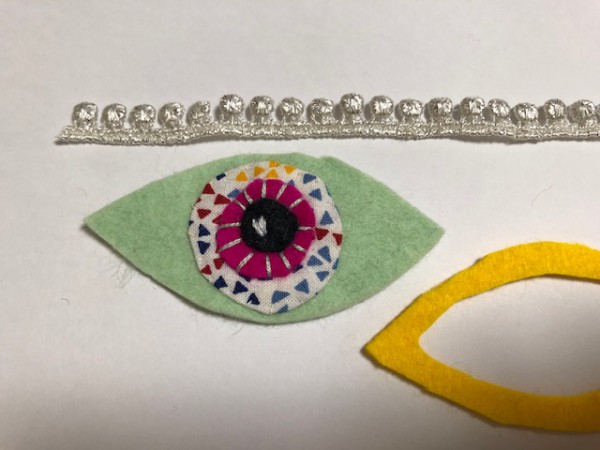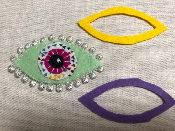 銀のブレードを付けた目玉ブローチを作りました。縁の色は紫と黄色と迷いましたが、最後に紫に決定。色合わせを楽しんでいます。