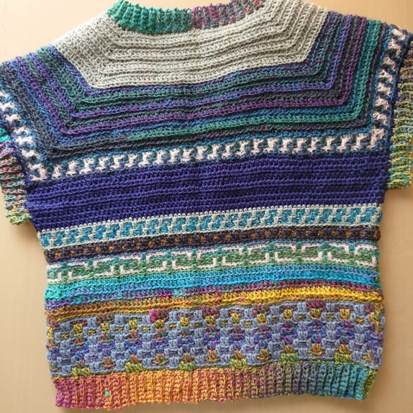 はぴやん 5年 コメントありがとうございます! 太さはまちまちですが、最大でも8号のかぎ針で編める太さの糸を使用しました ただ、8号の指定の糸でも物によっては太かったりするので注意が必要みたいです… 編んでから気づいたのですが、腰回りに使用した水色の糸はちょっと太かったようでそこだけ膨らんでしまいました 細すぎる糸は(青単色の部分)2本取りにして編んでます! ゲージはこんなもんかな〜…で、編んでしまいました トップダウンで編んだので、最初の作り目(鎖編み)を首に回して足りればそれでいいかなって感じです 一応、首の後ろ、肩、前身頃の1目(左右)、その他の増し目をする部分の1目(×4)と言う感じで多少の計算はしましたよ〜 でも、その他は大体です 棒編みだったらこうはいかないです…