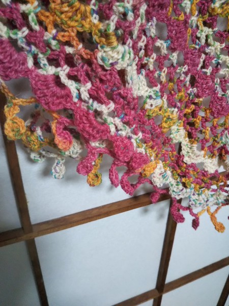 二種類の段染め毛糸を使ってにぎやかな雰囲気になりました。