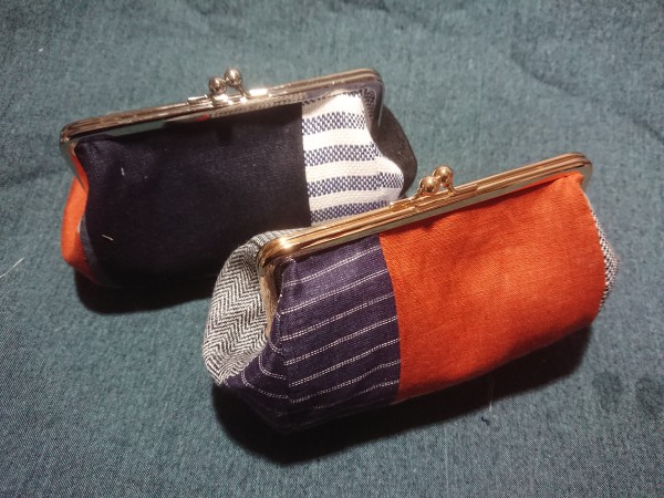| あまっていたカット生地を使って…がま口作り イシカワカオルさんの本より… 以前買っておいた口金を使って… 男でも使える小物入れがま口 |