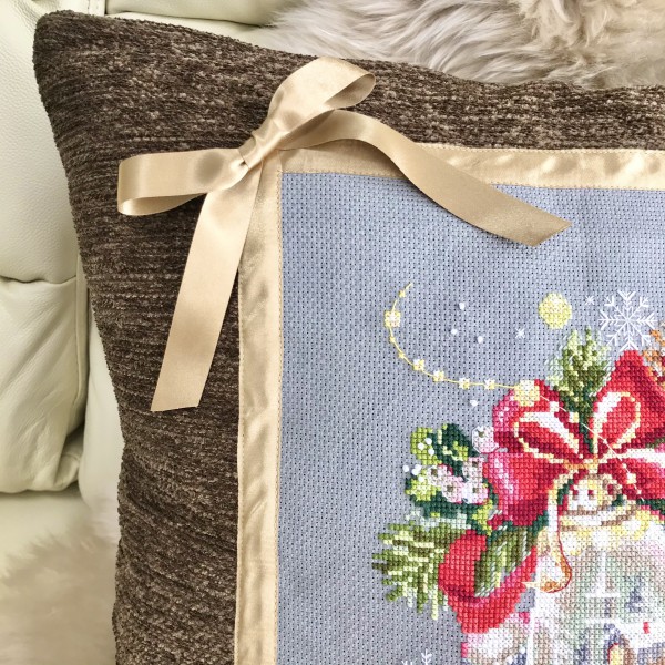 クッションカバーに縫い付け、周りをリボンで囲みました。