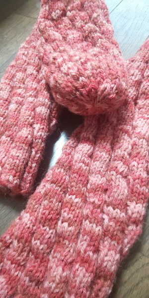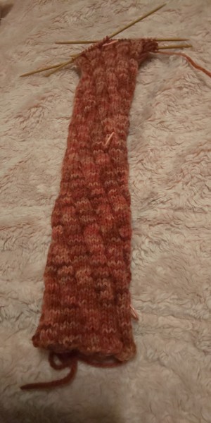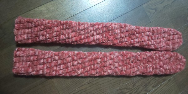もう片方は、去年1度完成させたけれど、長くするために爪先の減らし目をほどいて編み足しします。