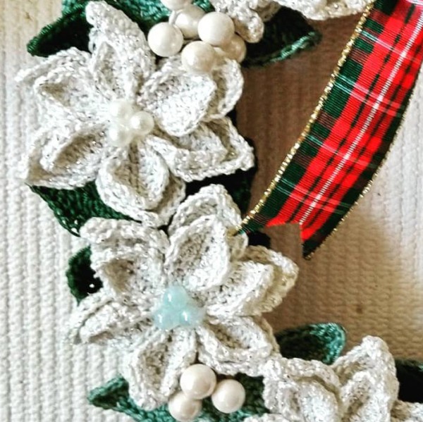 ポインセチアをシルバー入りの糸でレース編みしました。