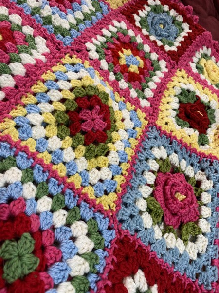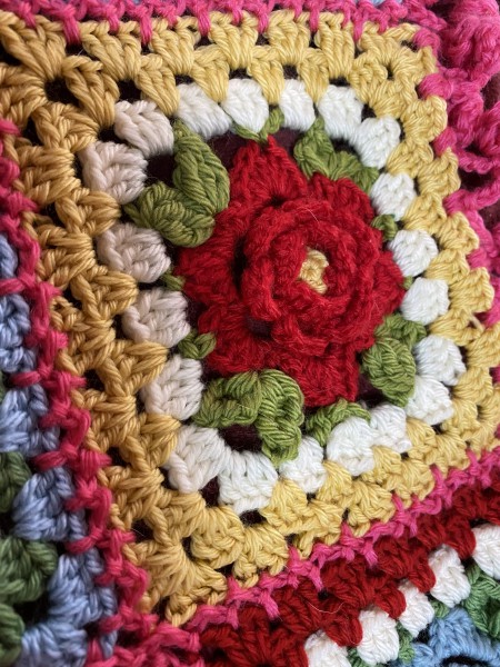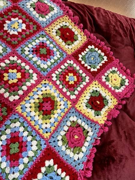 可愛いお花モチーフをたくさん作ってあったか色の膝掛けを作りました。