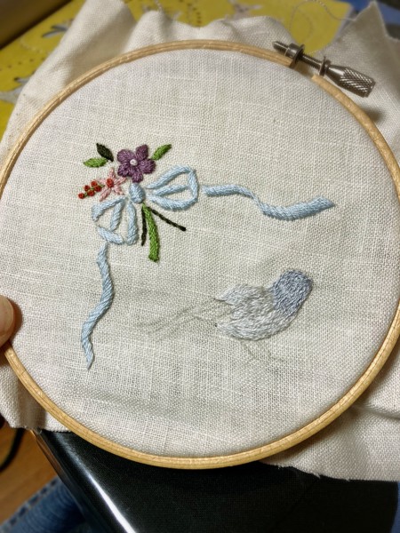 インコが好きな同僚への送別のプレゼントとして、インコは刺せないけれど…小鳥ちゃんを刺してファスナーポーチをつくりました。