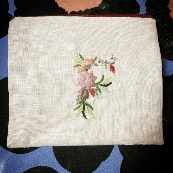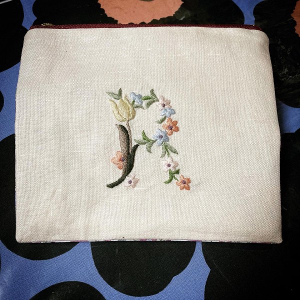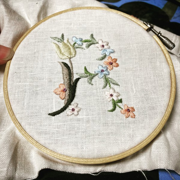 サテン刺繍でお花モチーフでイニシャルを刺繍しました。