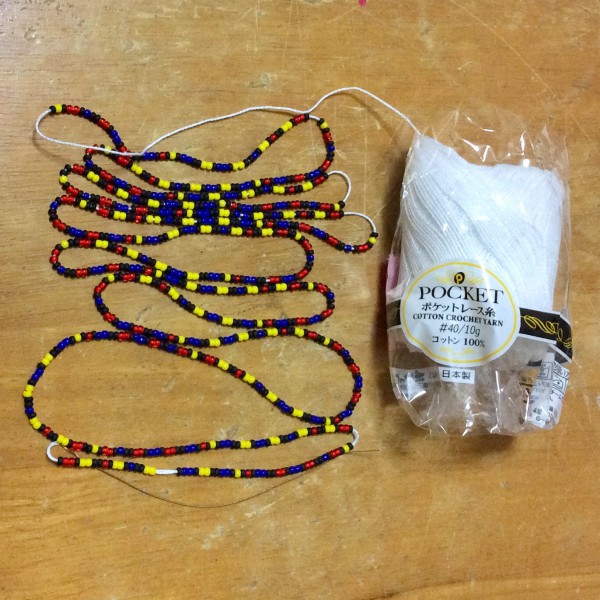図案を見ながらビーズ通し。#40のレース糸に、丸小ビーズを順番を間違えないように通します。