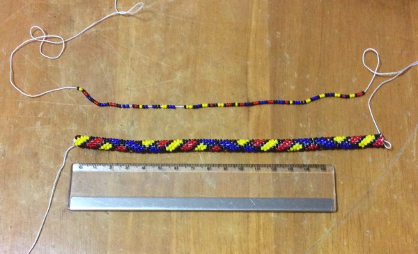 ブレスレットにするために合計で800個に近い数になるまでビーズを繰り返し通すんだけど、