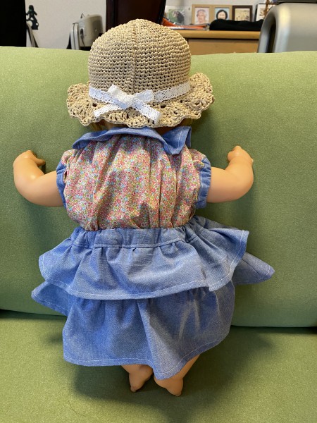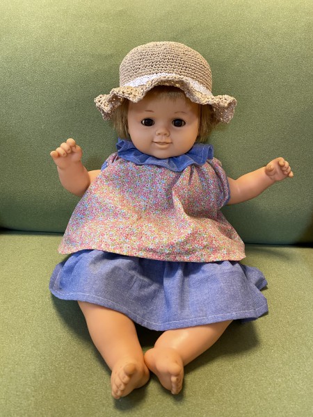 40数年前に実家にやって来たお人形のみかちゃん。新しく綿を詰め体を拭き髪を洗って綺麗にしました。洋服はベビー服からプルオーバーとスカパン&麦わら帽子を作りました。