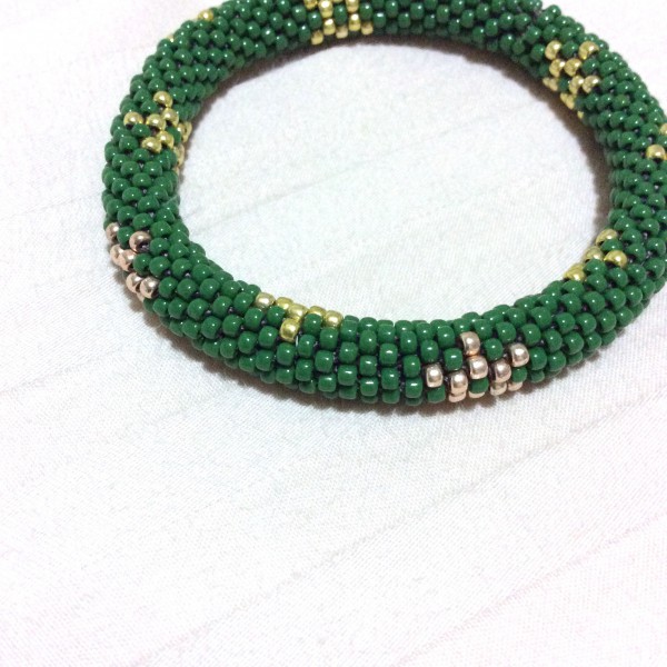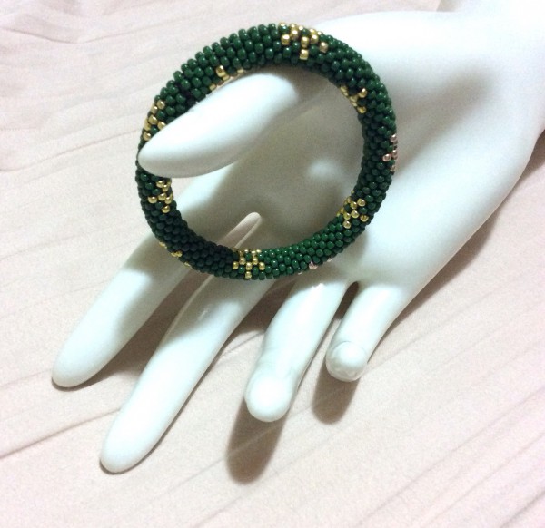 ビーズクロッシェ。深い緑のビーズと、ゴールドのビーズを使ったシンプルな模様です。