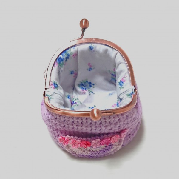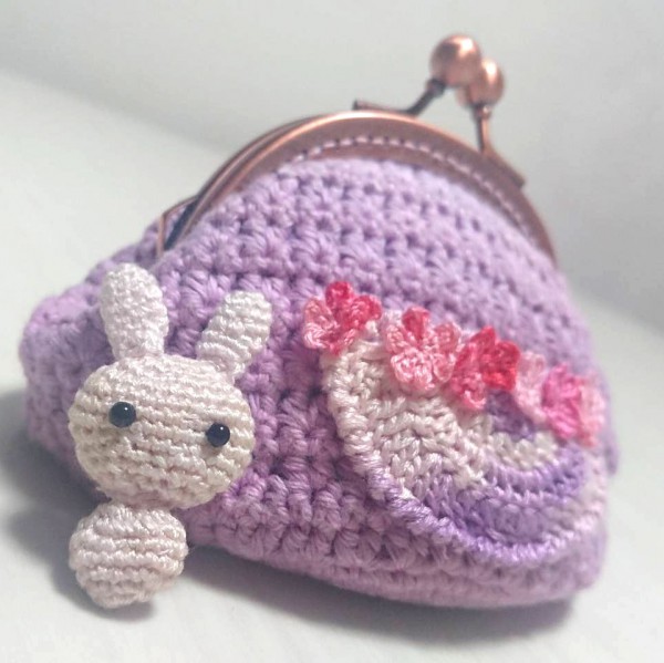 | 小物入れとして使うがま口を作りました。 薄いピンクのコットンの糸で編んで染めました。青みがかったピンクにしようとおもいましたが、青を入れすぎて藤色になってしまいました。写真が上手く取れなかったのですが、実際はもっとくすんだ色です。 ポケットを付けてウサギさんを入れました。持ち歩かず置いておくつもりなのでウサギは止め付けていません。 内布がきれいに付きませんでした。口金がまだあるのでまた練習します。 |