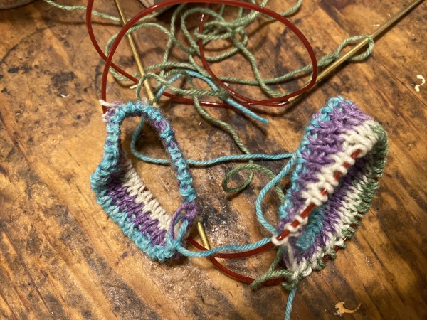 同じものを2回作るのを嫌っている私なので、一本の輪針の上に左右同時に乗っけて編んでいきます。