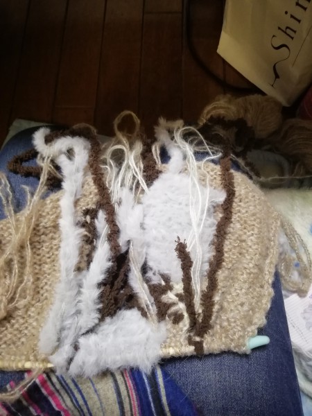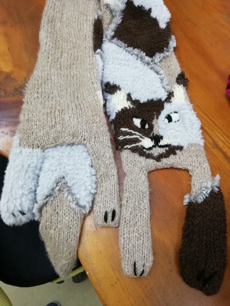 | 知人に頼まれて編んだ過去の作品です。 猫の目とひげは刺繍です。 手足は別に編んでメリヤスはぎしています。 筒状なので、糸始末が楽で、基本的にはメリヤス編みなのでサクサク編めます。 ちょうど良い太さの針がなく(10号、12号は有りましたが。)、ふと思い付き某コンビニで貰った箸を計ったら11号だったので、先を削って頭にゴムキャップを付けて全て箸で編みました。 今もこの箸は道具箱に入っています。 受け取った知人はとても喜んでくれたのですが、コンビニの箸で編んだとは言えませんでした。 糸はほとんど100均で揃えました。 |