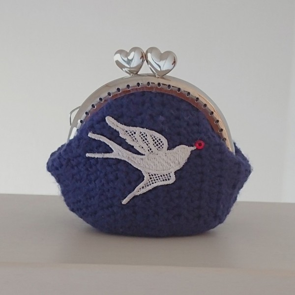 | 縫い付けタイプのがま口です。 鳥のもチーフを付け、「幸福の王子」のイメージで赤いラインストーンを足しました。 模様編みが一部間違えていました。口金を付けてから気づいたのでそのままです。 縫い付けもバランスが悪くて歪んでしまいました。 次はもっと丁寧に作ります。 |