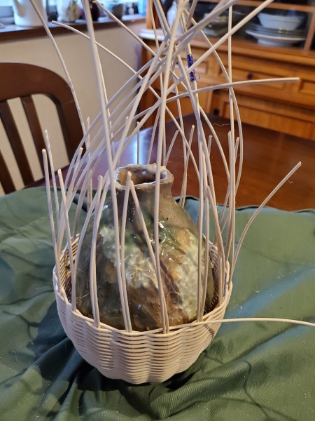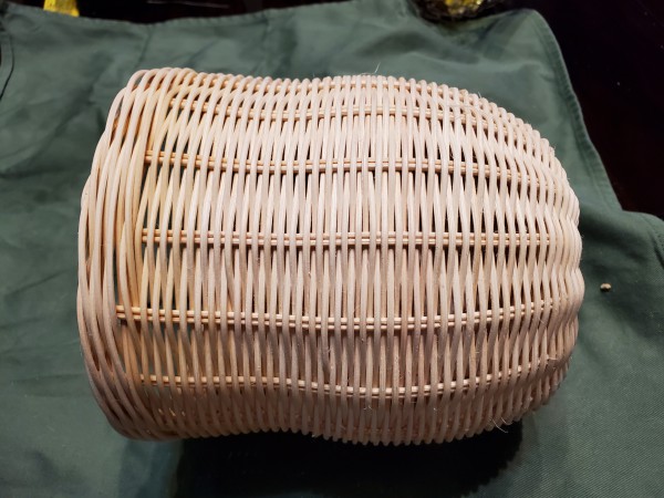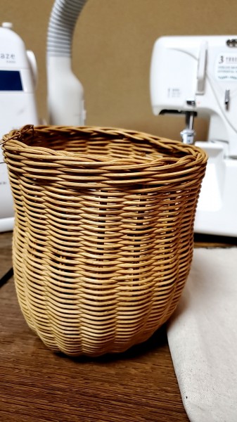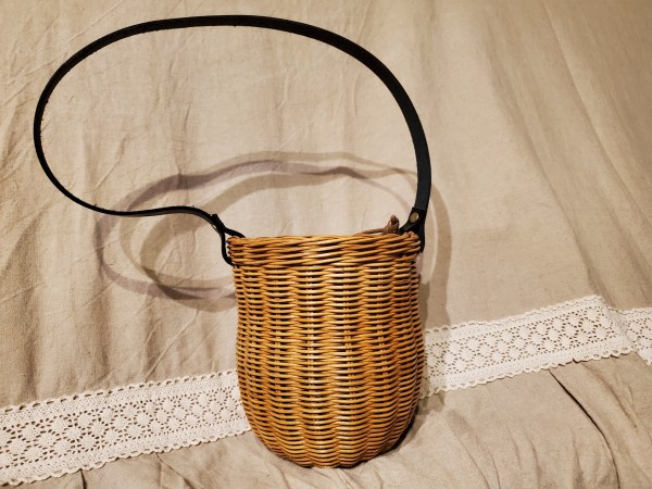編み上がったのでコーヒーで染めて乾燥後、ニスを塗り、内布袋を作成