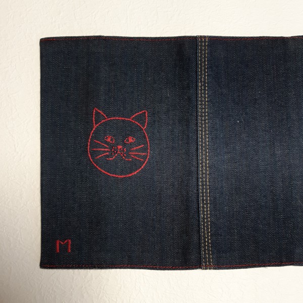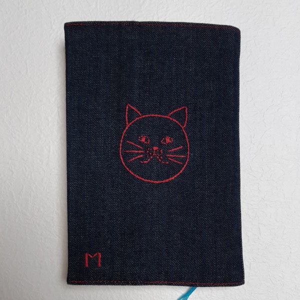 デニムパンツをリメイクしたブックカバーに猫の刺繍をしました。