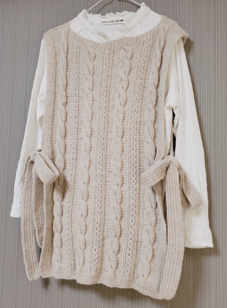 | サイドリボンのベストで真っすぐ編みで編んでいます。 作り目111 5段は一目ゴム編み 模様編み 最後中心を一目ゴム編みにして肩を繋ぐ サイドにリボンを編んだら完成。 |
