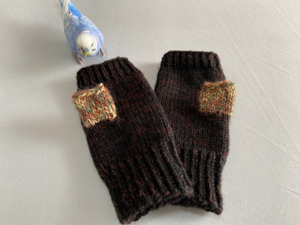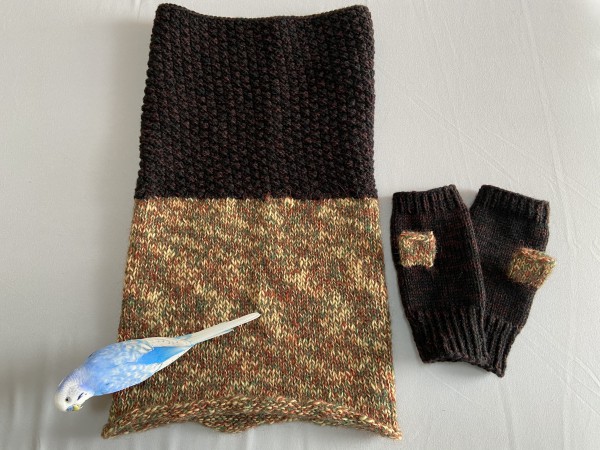 輪針で腹巻きスヌードを編みました。追加でハンドウォーマーも編みました。イタリアンカラーの毛糸はスッキリ使い切る事が出来ました(^^)