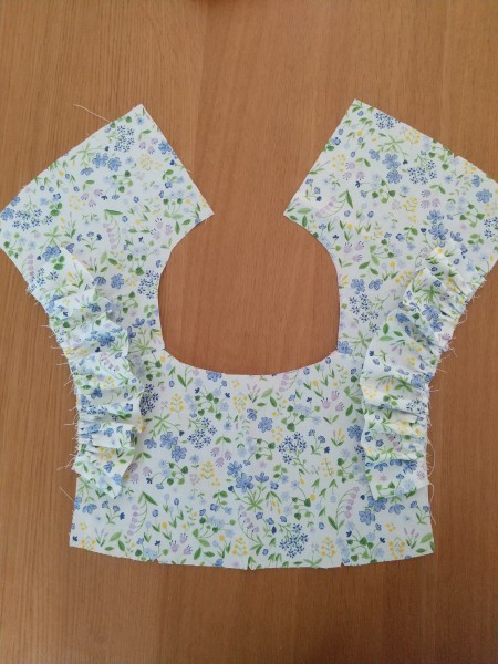 身頃の肩を縫い合わせ、フリルにギャザーを寄せて身頃に仮縫いしました。