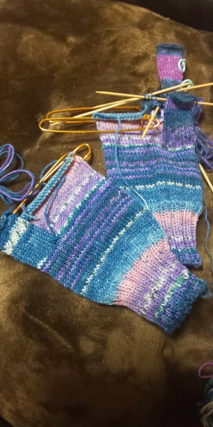 案の定手の甲と親指で糸が足りなくなったので、福袋で買ったHundertwassers24色の中から、似た色が入っていた3203で続きを編んでいます。
