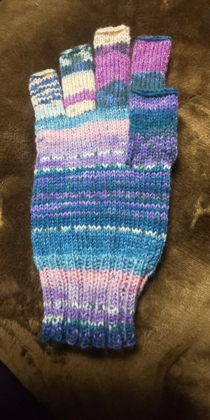 ベリースムージーで手袋を編むとこんな感じになるのですね!途中から他の糸という事ですが、それがかえって面白い効果になってますね(^^)