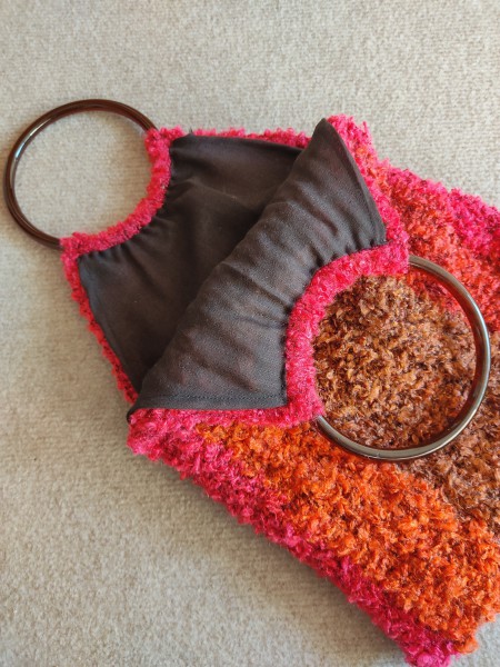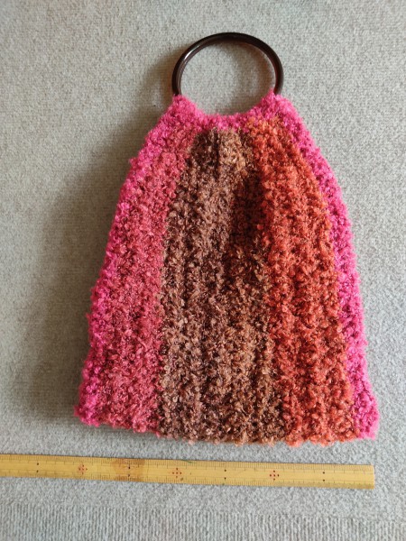 イエローのリングバッグとサイズ違いですが作り方は全く同じ。最初に作ったのがこちらで、モコモコした糸の方が編み目の雑さが隠せるという事に後から気づきました(笑)