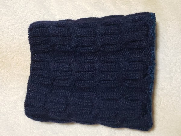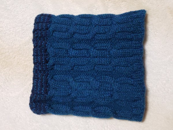 | 【 リバーシブルに使えるツートンColorのカウル】 とても手触りの良い「原毛に近いメリノウール」という毛糸に出会い、チクチクしなさそうなので首もとに。 濃紺とピーコックブルーで、作業着の青にも合うカウルを。 |