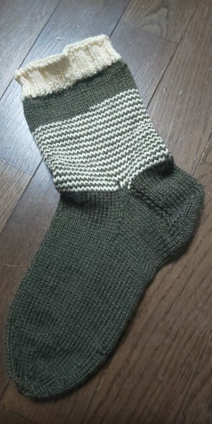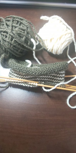 でも、もうオリーブグリーンの毛糸はごむ編みの分残ってないので、白で編み足すことに。