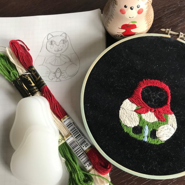 昔制作したマカロンポーチのなす形プラ型を使用して、黒猫マトリョーシカ刺繍のブローチを制作しました。