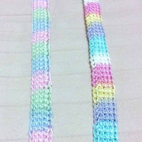 コットンのレース糸をアフガン編みでテープ状に編んで、ネックストラップを作りました!