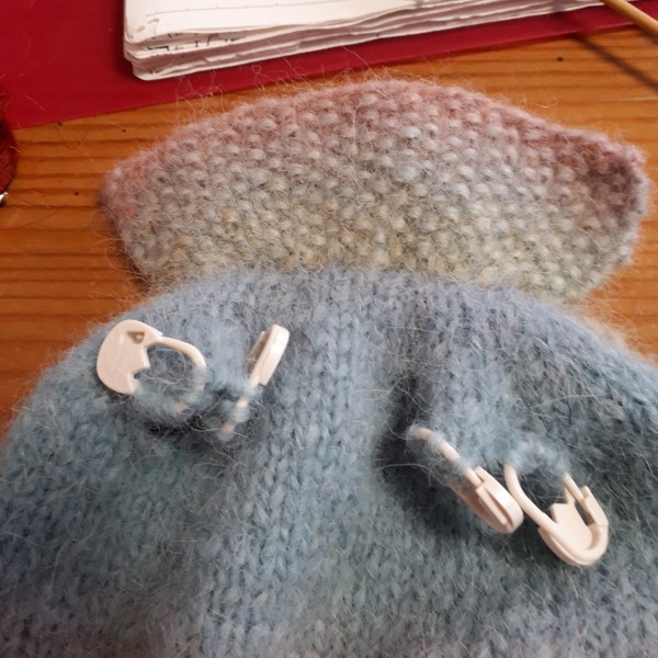 襟、袖付けを終えて編みが終了。 次回は水通しして、ボタン付けです。
