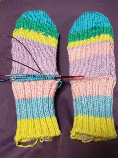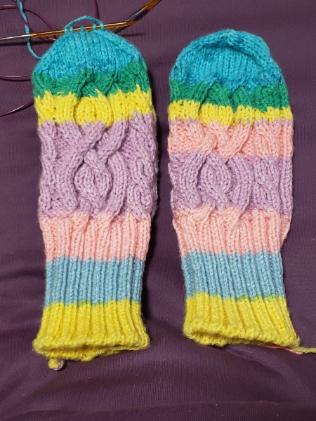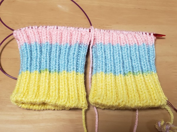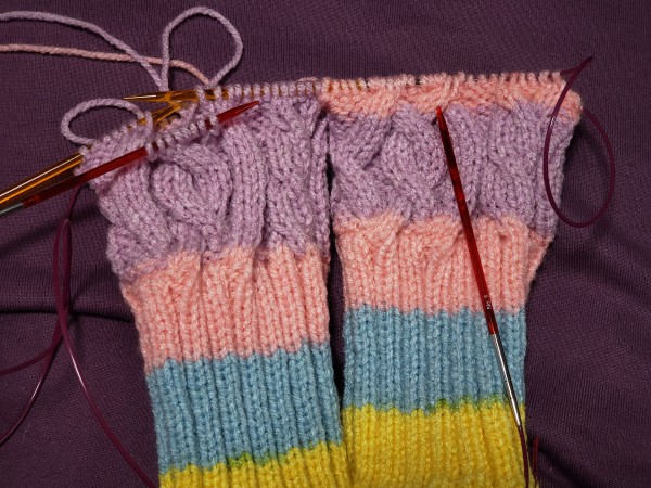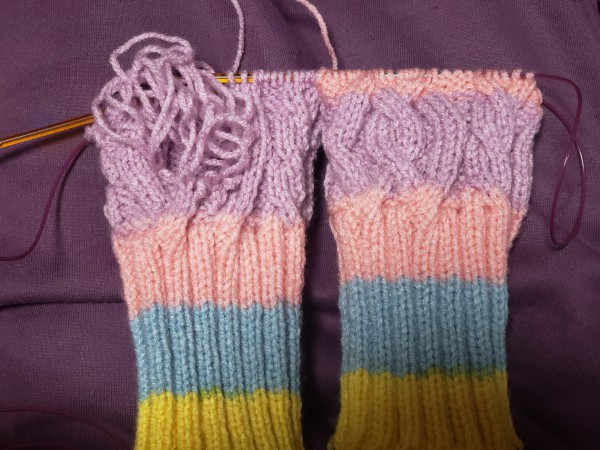 colorNO.21の黄色~水色~ピンク~紫色の2玉が終わり、それ以外に少し残っていたピンクと紫を使い、模様編み部分がほぼ終わり。