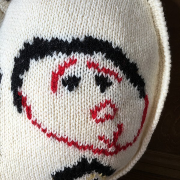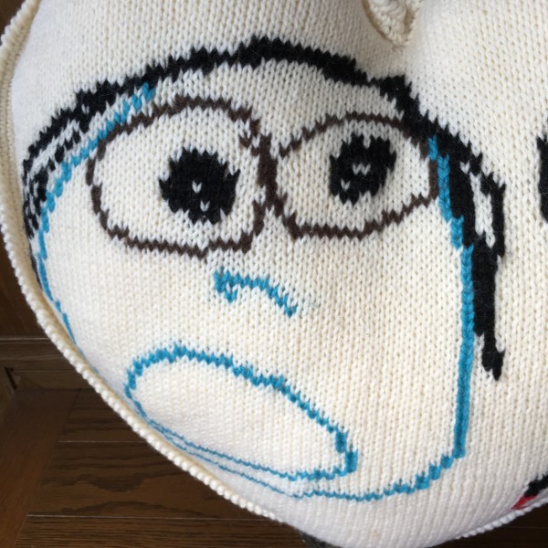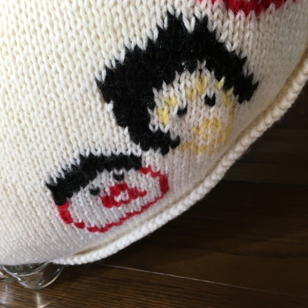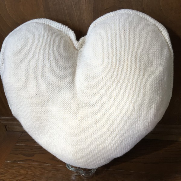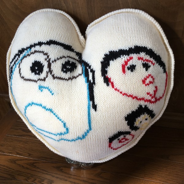 息子が幼稚園のときの絵を、ハートのクッションに編み込んで作ったもの。