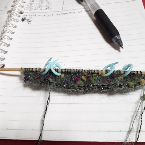 昨日のポチポチカーディガンの注文糸待ちの間にこちらを編み始めました。 トッピングモールcol.107 キッドモヘアファイン col.不明ライトモスグリーン 前立て(右側のみ)までで今日はおしまい。