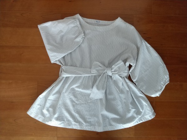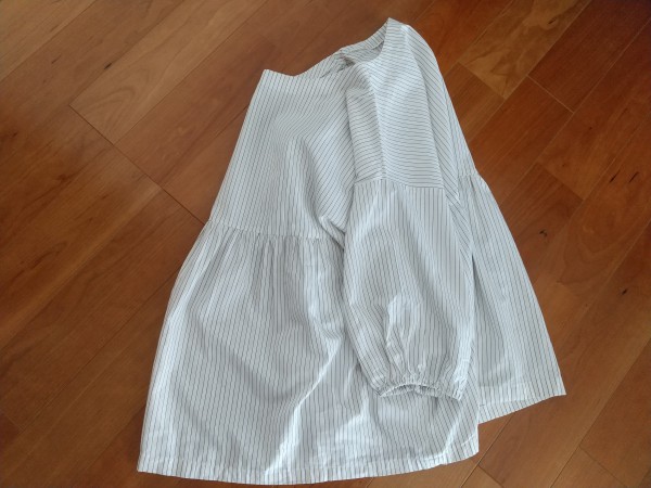 | 自分用のブラウスです。 先日作った水色チェックのワンピースの型紙をアレンジして、お尻までカバーしてくれる丈で作りました。 ギャザーは少なく。 後から思い付きで共布のリボンとベルトループを作りました。 ふんわりしたシルエットですが、ウエストを絞るとスタイルアップ! ストライプの柄も相まってオフィスにも着ていけそうなブラウスになりました。 |