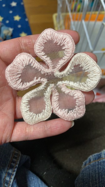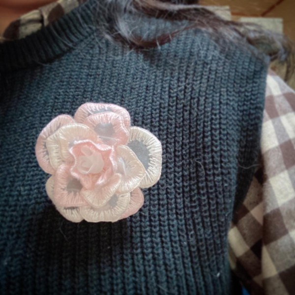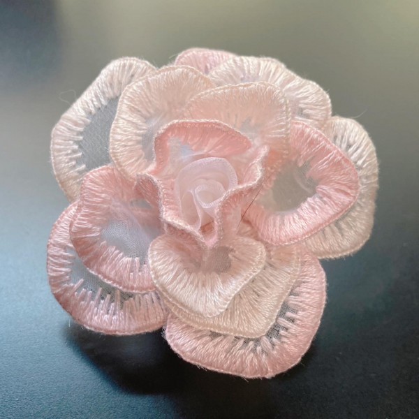 スタンプワーク(立体刺繍)のバラのコサージュです。シルクオーガンジーに刺しているので柔らかさと透け感を感じたくて、あまり刺し込まないようにしました。