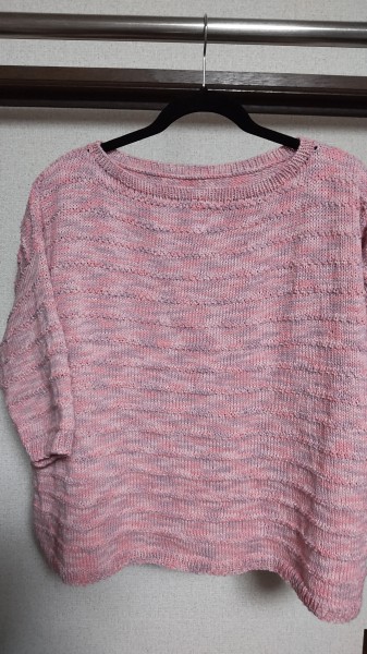 | まっすぐ編む春夏用のプルオーバー。 身頃の幅を大きくしすぎて、脇のところがちょっともたつく感じに。 逆に袖や襟ぐりをもう少しゆったりさせたかった減らし目しなくてもいいくらいだったかも。 色々反省点が多いです。 |